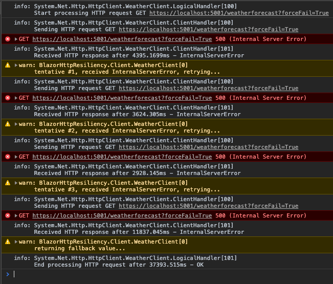 The system is trying the call for 3 times before reverting to the fallback value. Everything is logged so we know what’s happening, but we can also instruct Polly to execute some custom operation, in this case logging some additional warning messages.